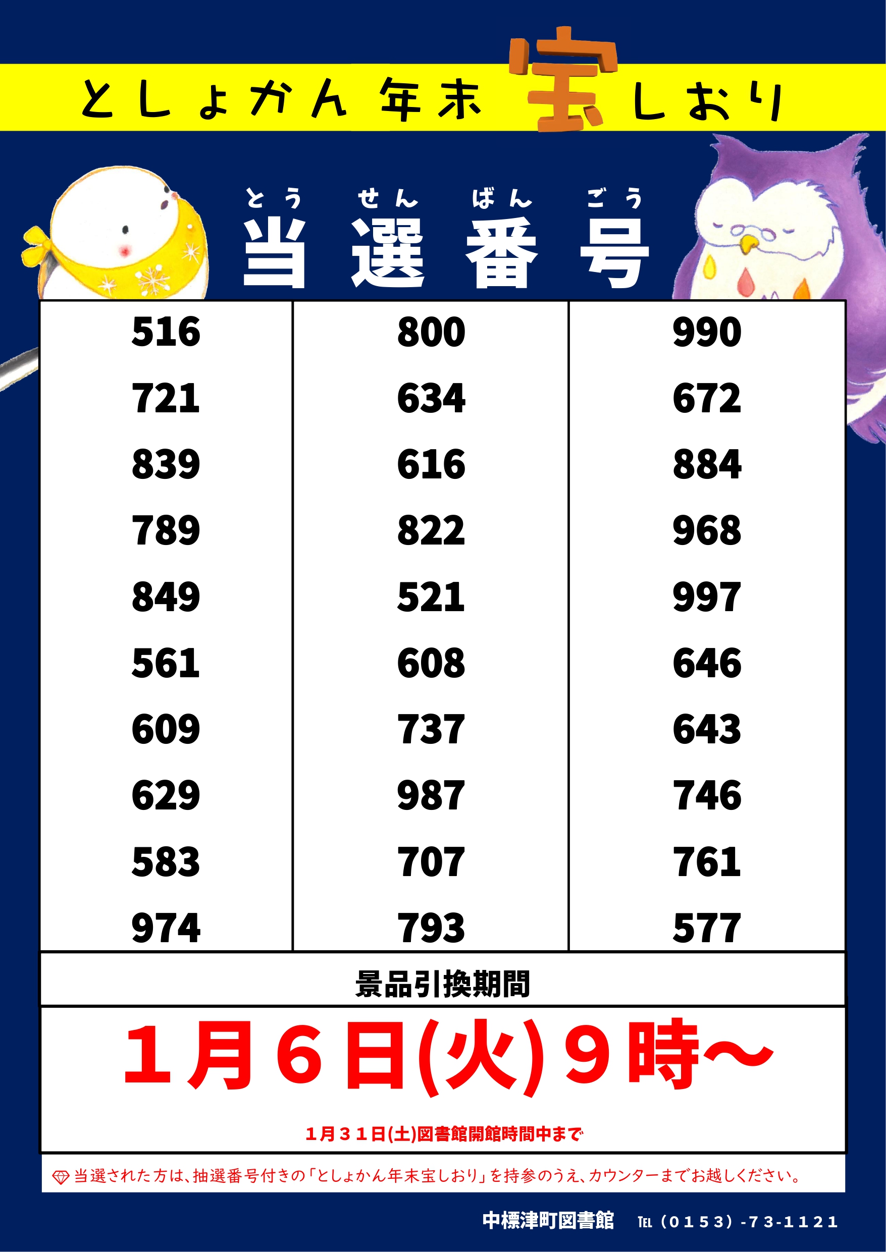 💎当選された方は、抽選番号付きの「としょかん年末宝しおり」を持参の上、カウンターの職員にご提示ください。