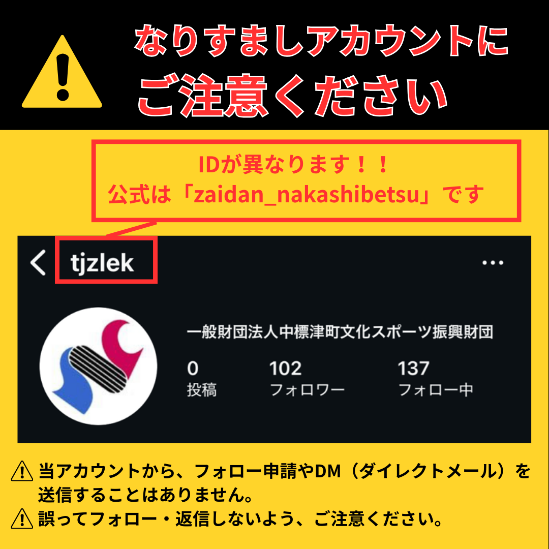 「中標津町文化スポーツ振興財団」 公式Instagramのアカウントを装った「なりすましアカウント」が確認されています。